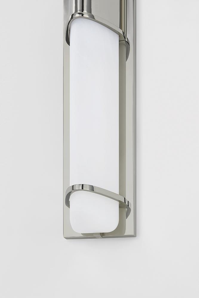 Pairing minimalist metalwork with matte cloud glass, Tottenville is a highly versatile sconce for a powder room or bath area. The glass shades feature a unique triangular profile that gives this fixture both slimness and its distinctly modern feel. Choose from a single or dual light sconce with an Aged Brass or Polished Nickel finish.