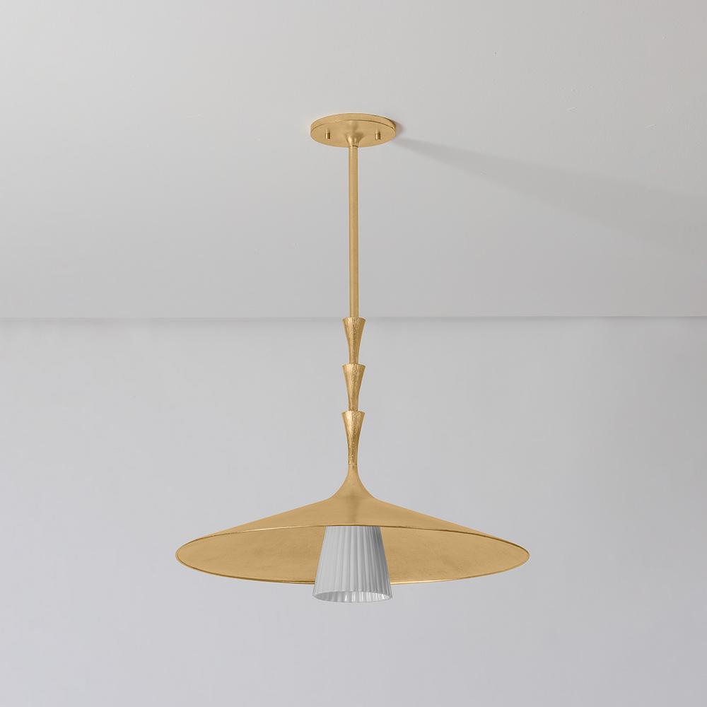 Nature meets geometry in the elevated Vails Gate. This pendant features a repetitious stack of flared trumpet forms, reminiscent of the nodes on a flower stem. Fluting details add depth to the symmetrical design, nodding to its organic origins. Finished in Vintage Gold Leaf, Vails Gate is available as a pendant light in two sizes and a 1-light sconce.