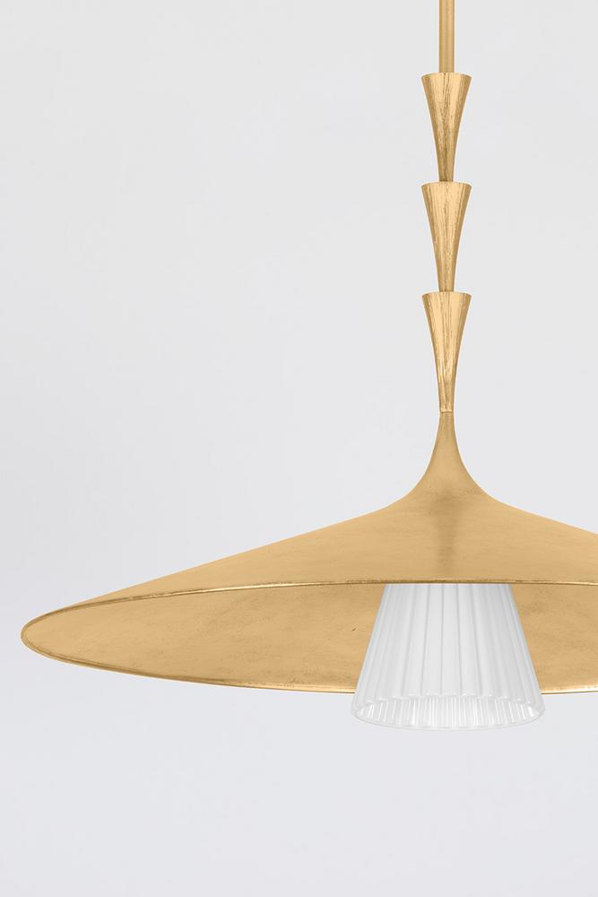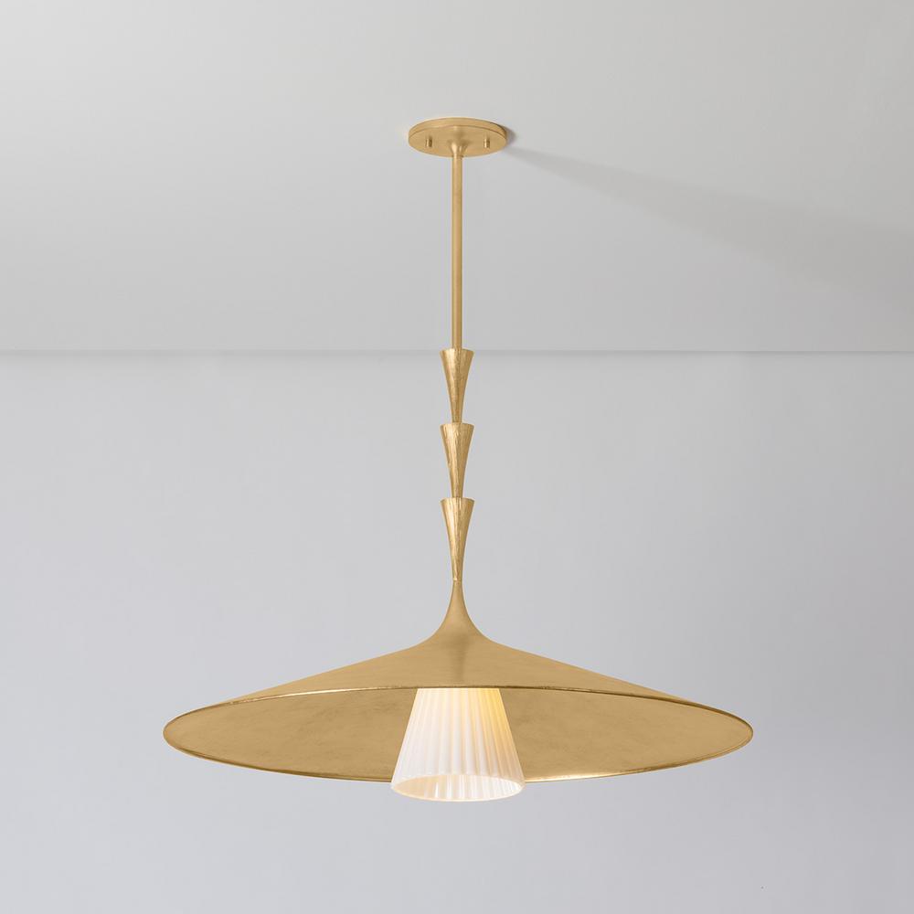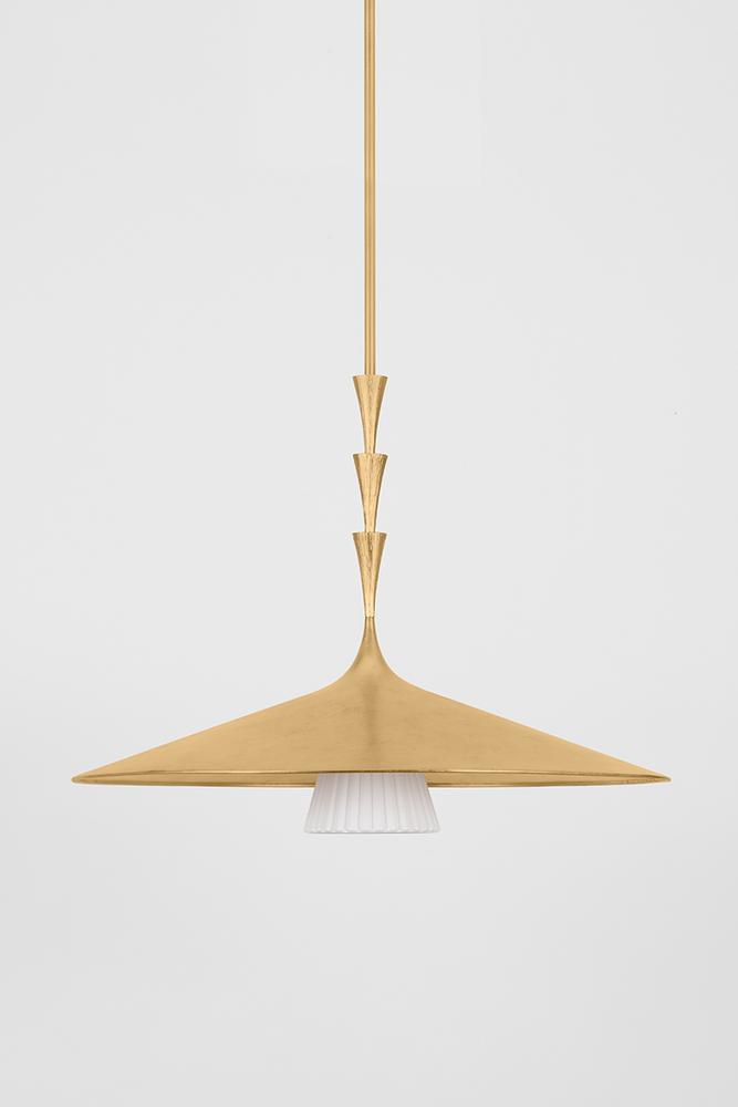 Nature meets geometry in the elevated Vails Gate. This pendant features a repetitious stack of flared trumpet forms, reminiscent of the nodes on a flower stem. Fluting details add depth to the symmetrical design, nodding to its organic origins. Finished in Vintage Gold Leaf, Vails Gate is available as a pendant light in two sizes and a 1-light sconce.