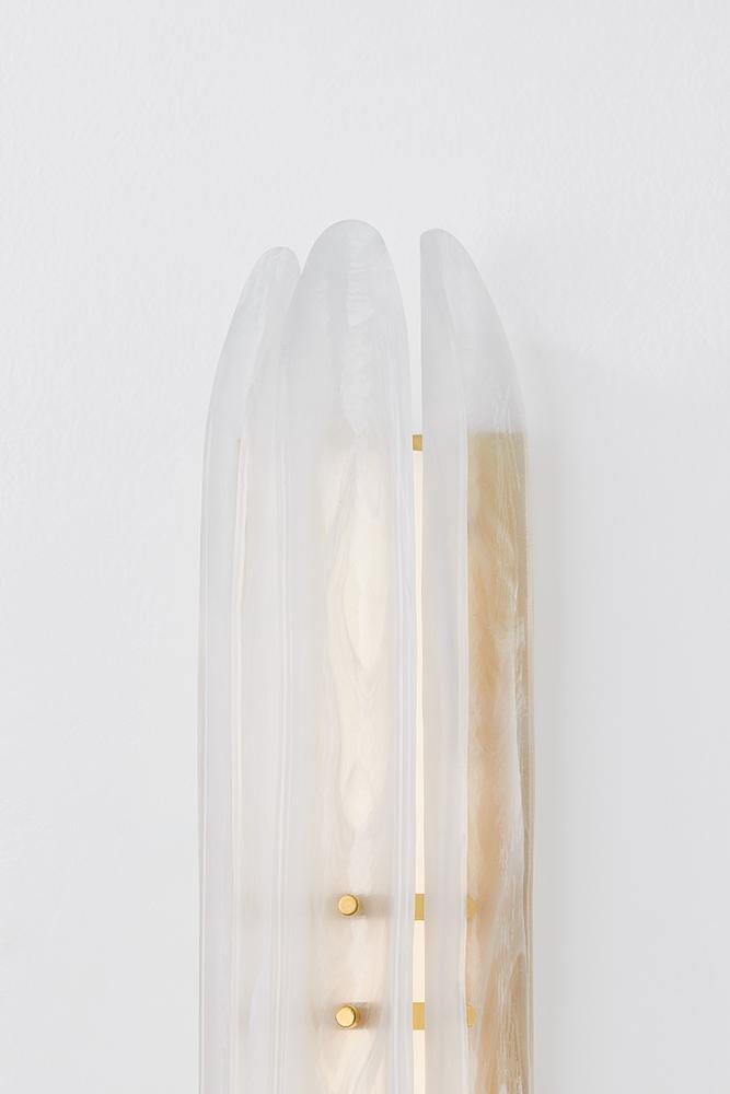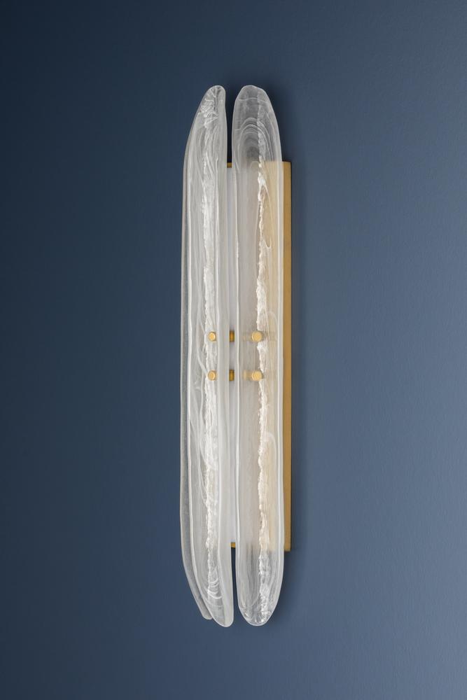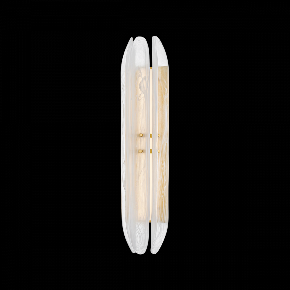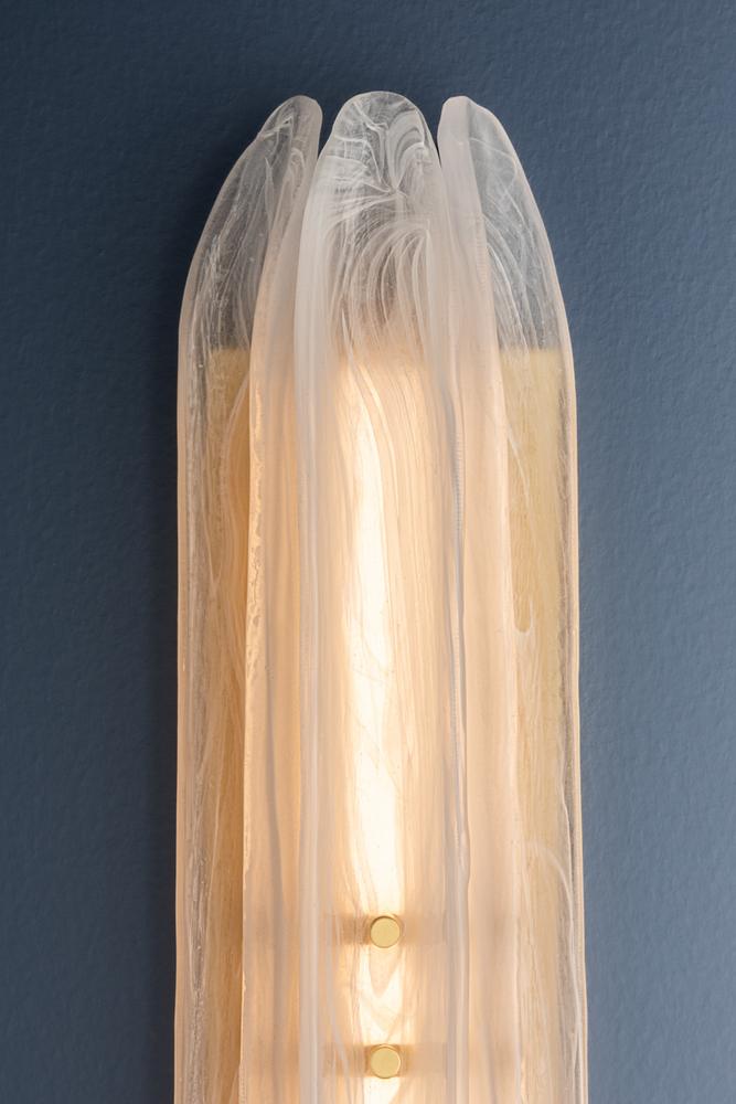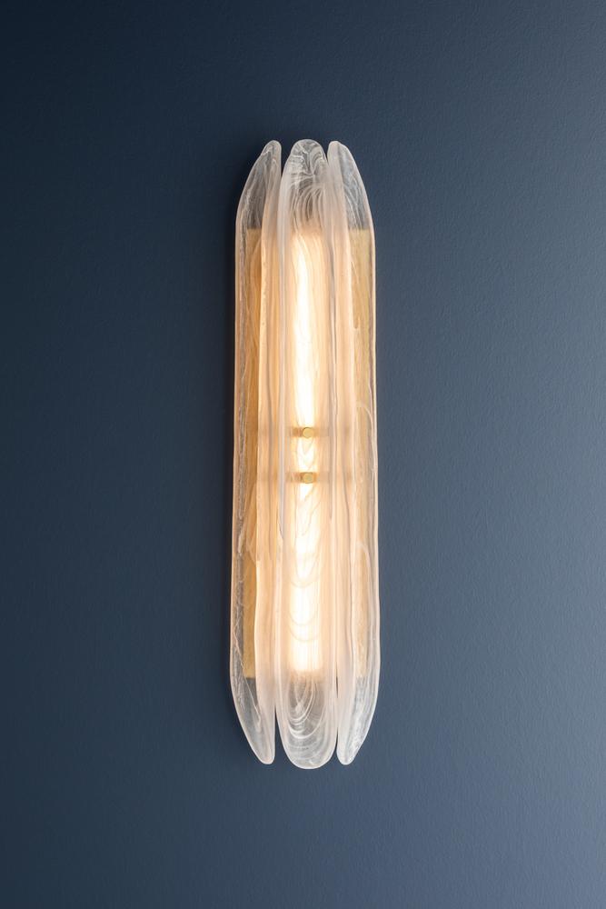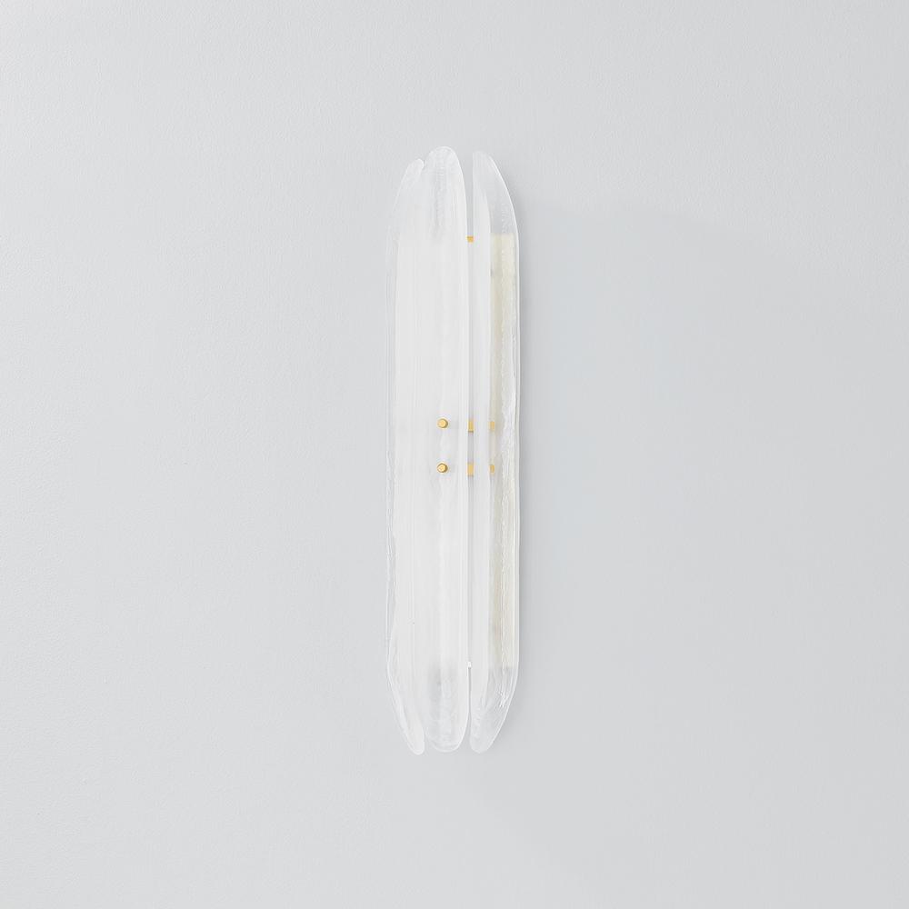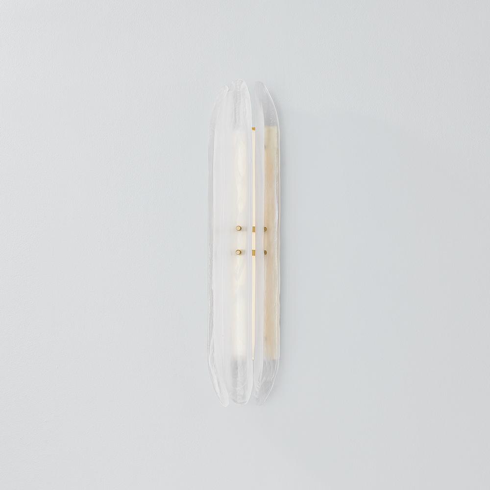 Elevating a minimalist silhouette, the Westtown sconce uses exquisite materiality to create a subtle statement. Secured with small Aged Brass thumbscrews, long pieces of piastre glass are positioned before an LED light source. Internally etched with a white swirl pattern, the glass creates a soft light diffusion, perfect for a hallway or bathroom.
