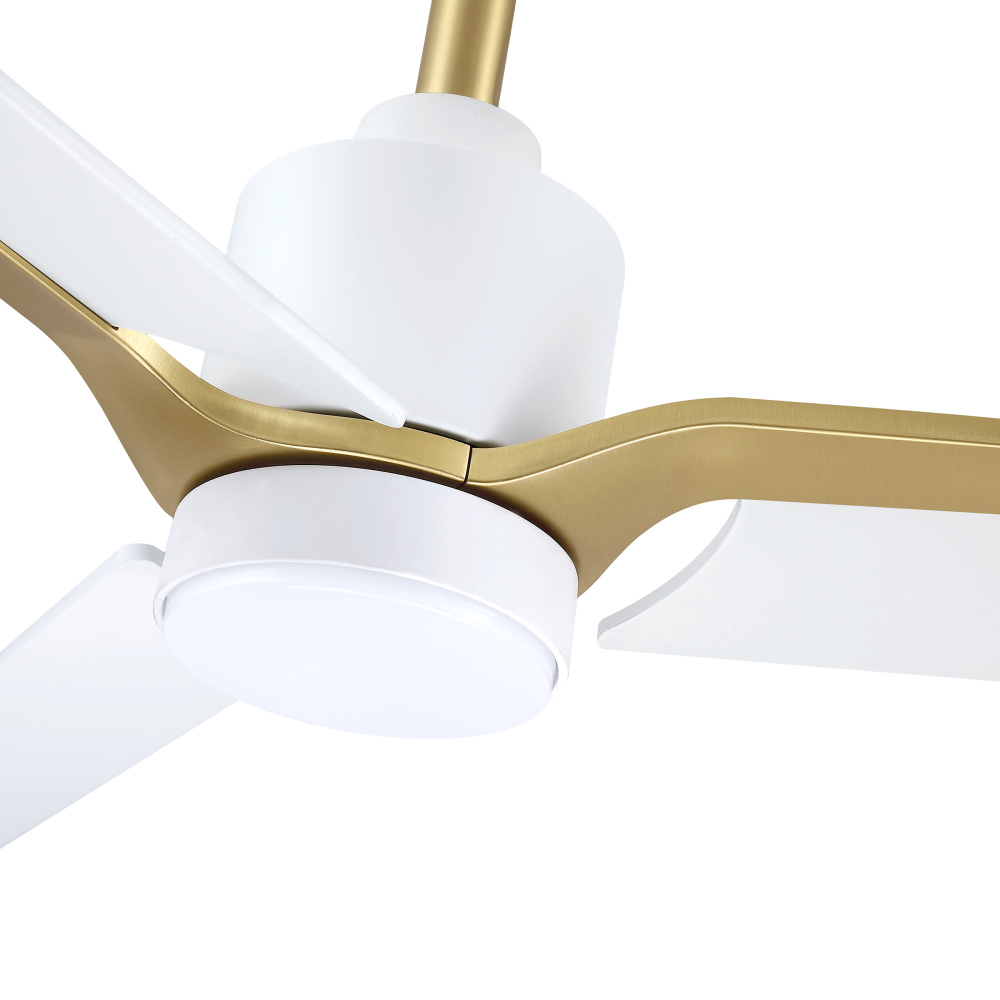 ANCON 52 in. 3 Blade DC Motor Damp Location Ceiling Fan with Adjustable Color LED Light Kit in a White & Brass finish with White blades. The included Full-function Remote Control provides 6 Speeds, CCT (LED Color) Adjustability, LED Dimmer, Reverse Function, 2/4/8 Hour Timer to shut Fan off Automatically, and a Variable Wind feature which modulates Fan Speed to simulate a Natural Breeze.