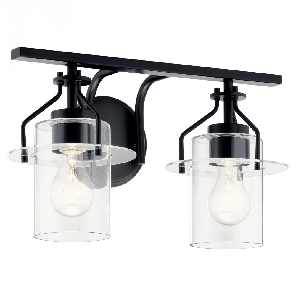 The Everett™ 16 inch 2 light vanity light adds a dash of industrial glam above your bathroom mirror. Two mini Clear Glass pendants are suspended from curved arms and round backplate in Black. Look closely, and you'll see delicate discs hold each pendant — and your attention.