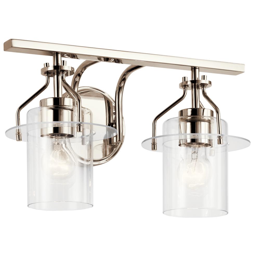 The Everett™ 16 inch 2 light vanity light adds a dash of industrial glam above your bathroom mirror. Two mini Clear Glass pendants are suspended from curved arms and round backplate in Polished Nickel. Look closely, and you'll see delicate discs hold each pendant — and your attention.