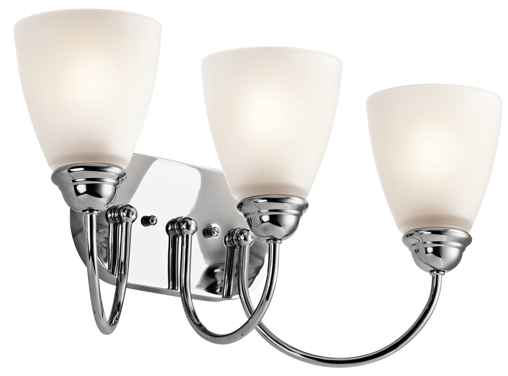 The Jolie 20.25" 3 light vanity light features a classic look with its Chrome finish and satin etched glass. The Jolie vanity light is perfect in several aesthetic environments, including transitional and traditional.