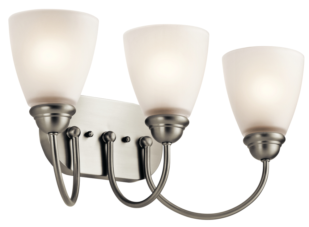 The Jolie 20.25" 3 light vanity light features a classic look with its Brushed Nickel finish and satin etched glass. The Jolie vanity light is perfect in several aesthetic environments, including transitional and traditional.