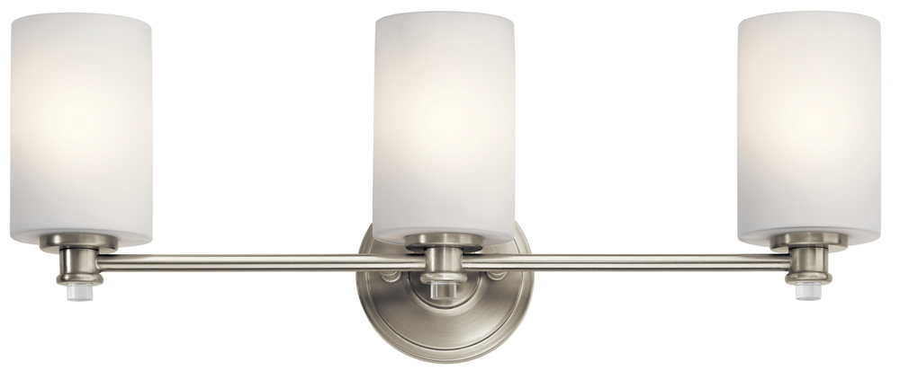 The Joelson 24" 3 light vanity light features a classic look with its Brushed Nickel finish and satin etched cased opal and clear glass accent glass. The Joelson vanity light is retro inspired and is perfect in several aesthetic environments, including traditional and modern.