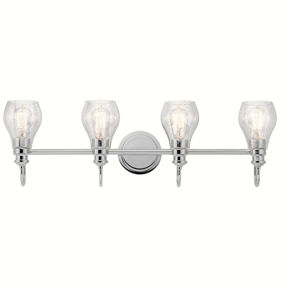 An updated twist on a popular vanity lighting style, this Greenbrierâ„¢ collection 4 light bath light's teardrop-shaped shades feature clear seeded glass for added visual interest. Tailored and subtly detailed arms in a brilliant Chrome finish bring a sophisticated feel.