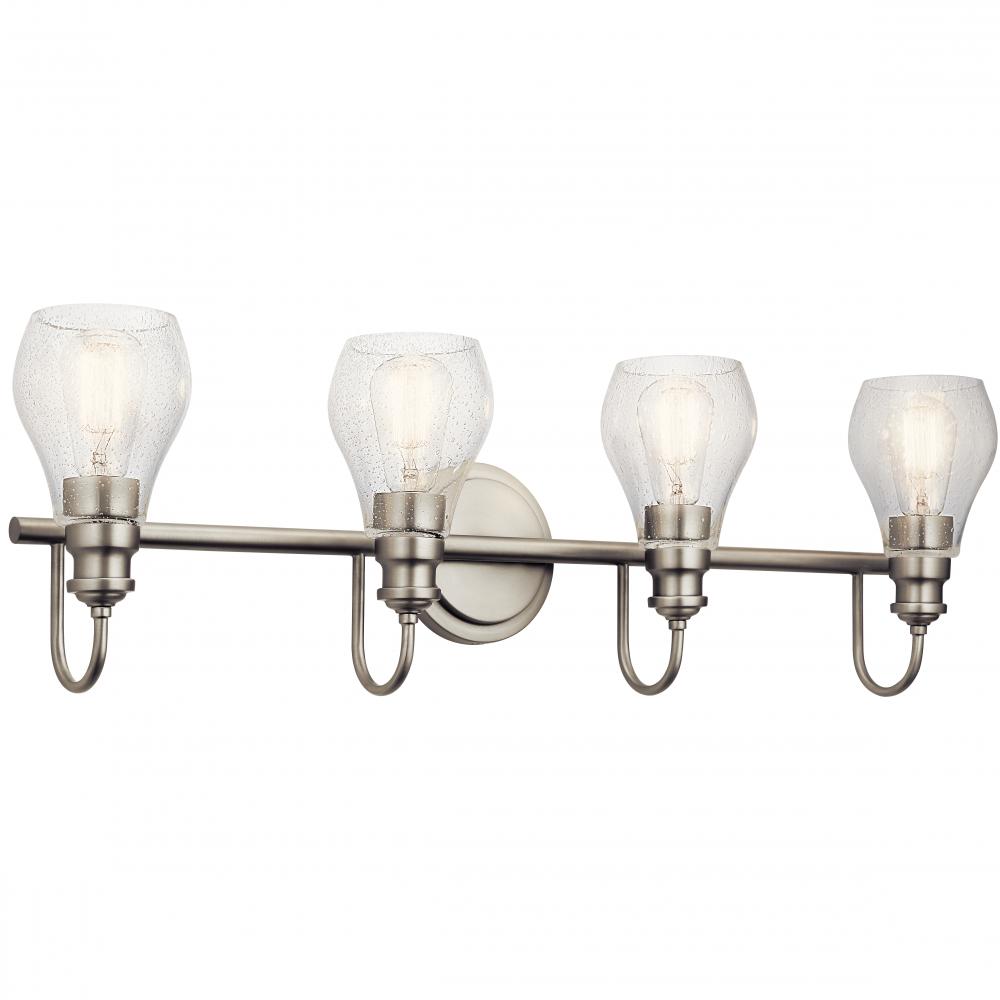 An updated twist on a popular vanity lighting style, this Greenbrier collection 4 light bath light's teardrop-shaped shades feature clear seeded glass for added visual interest. Tailored and subtly detailed arms in a brilliant Nickel finish bring a sophisticated feel.