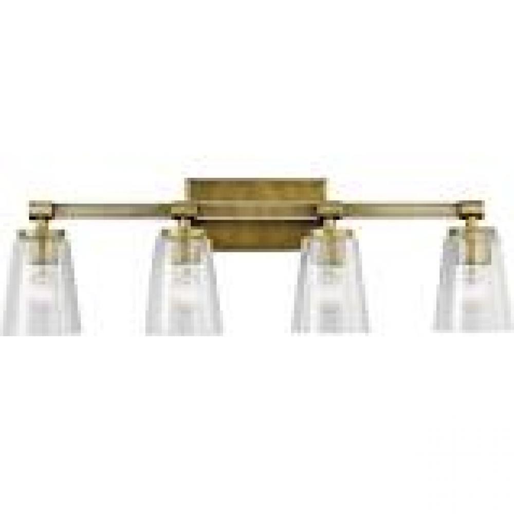 With a clear crystal tube as its centerpiece, the Audrea™ collection 4-light bath light combines a popular Natural Brass finish and other materials for maximum visual effect. The look draws on the popularity of Lucite accents found on furniture, hardware and other home décor pieces.