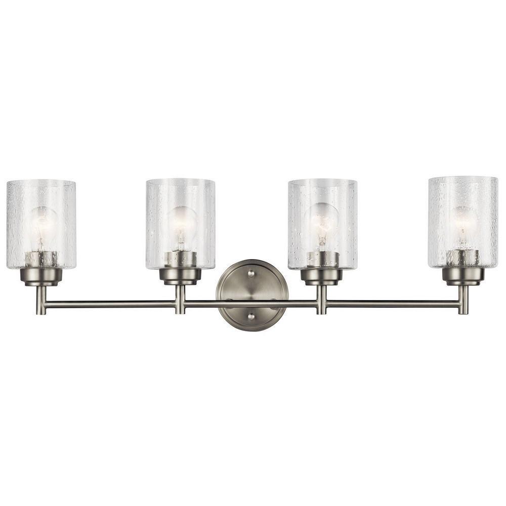 The Winslow 30" 4 light vanity light features a classic look with its Brushed Nickel finish and clear seeded glass. Winslow vanity light is perfect in several aesthetic environments, including traditional and transitional.