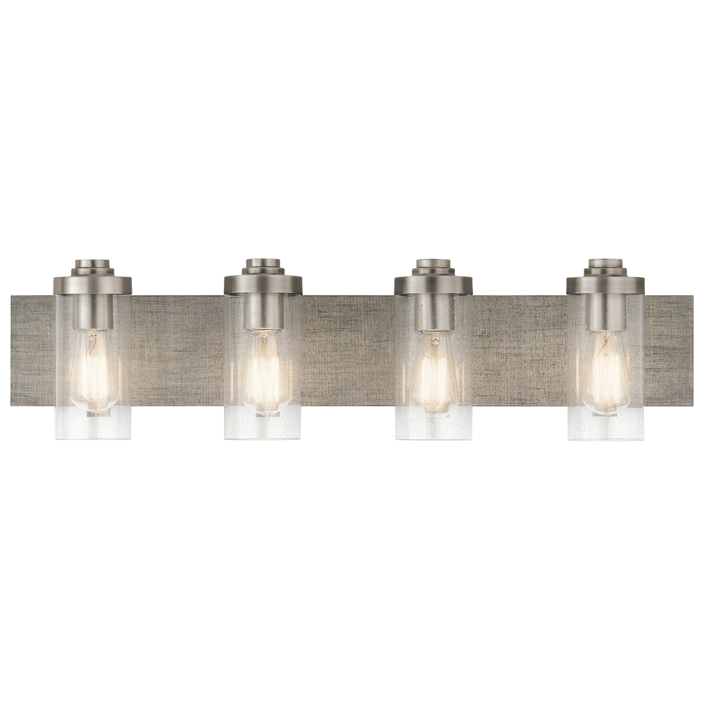 The look of rustic reclaimed wood planking serves as a backdrop for the unexpected style of the Dalwood™ 4-light bath light. The Classic Pewter finish and Seeded glass adds to the vintage feel.