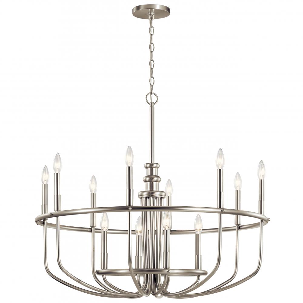 The Capital Hill 30.75" 12 light chandelier features basket inspired curved arms that adds dimension and visual interest with its Brushed Nickel finish. A perfect addition in several aesthetic environments, including traditional and modern.