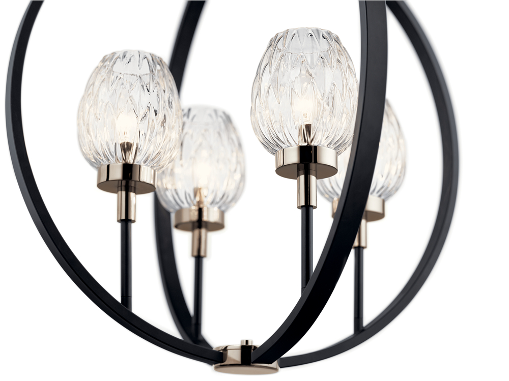 This 4 light pendant from the Moyra collection features black orbs, crystal-inspired goblet shades and rich Polished Nickel details create a striking look thatâ™s both modern and vintage. The faceted glass intensifies and refracts the light.