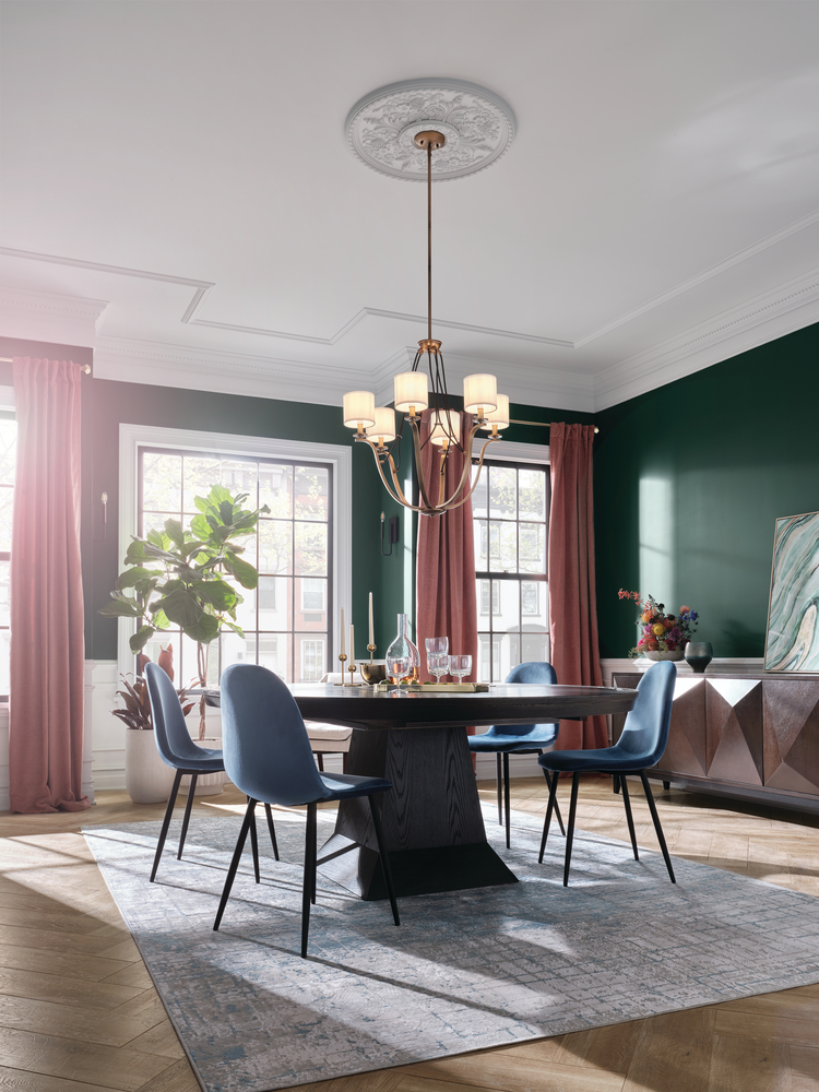 With elegant curves, fabric covered rope detail and white linen shades the 6-light chandelier with Natural Brass finish from the Thisbe™ collection is far from your common classic style.