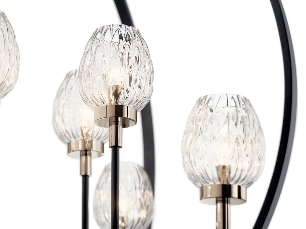 This 8 light chandelier from the Moyra collection features black orbs, crystal-inspired goblet shades and rich Polished Nickel details create a striking look thatâ™s both modern and vintage. The faceted glass intensifies and refracts the light.