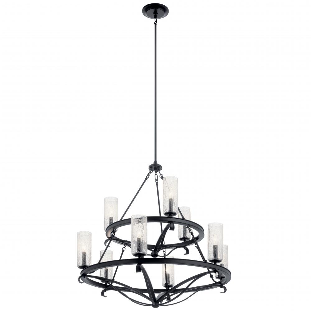 Black metalwork is making a big statement in todayâ™s homes: in banisters, hardware and more. The Krysia collectionâ™s gently bended metal frame mimics this ironwork for a cohesive touch. Crackle glass shades soften the overall look and add sparkle to the light.