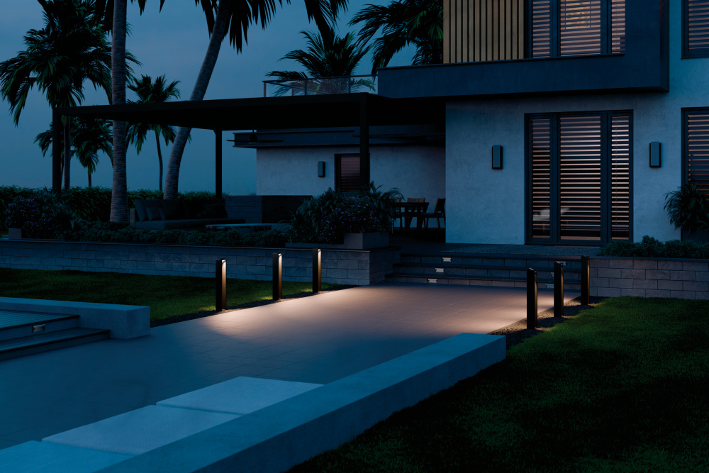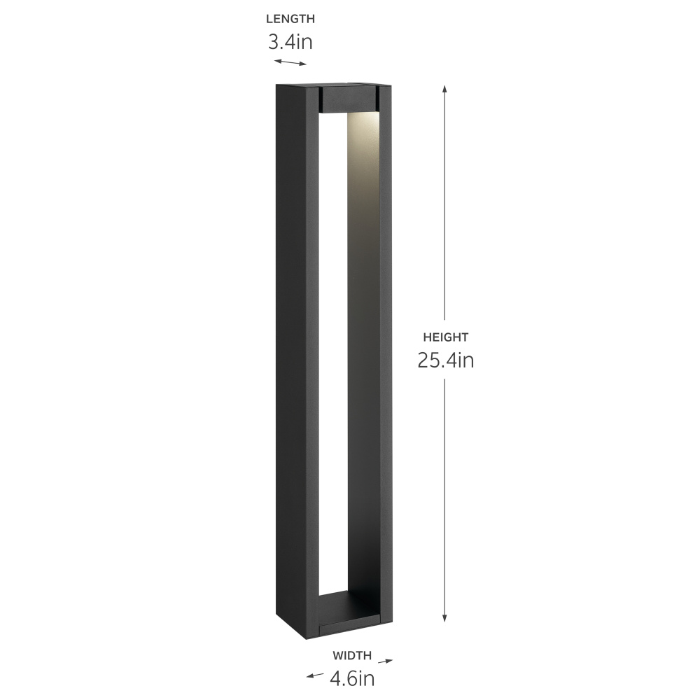 Illuminate outdoor spaces with the 12 Volt LED 25.4" Aimed Bollard in Textured Black. This stylish path light offers a 3000K integrated LED light source, delivering a pure white light to a path or walkway. The innovative design allows the linear, cube-shaped top to tilt up to 45 degrees forward or backward, giving you precise control over where the light shines. Crafted to withstand the elements, the light's electrical components are fully sealed under a polycarbonate lens and its solid aluminum construction offers a robust stake-to-stem connection. The clean, modern lines of this bollard light effortlessly complement a wide range of exterior styles, making it a versatile addition to any outdoor setting.