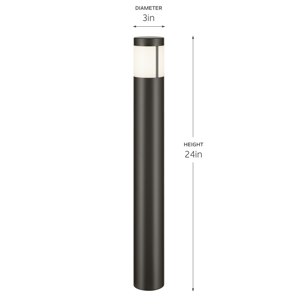 Illuminate outdoor spaces with the 12 Volt LED 24" tall Round Bollard in Textured Architectural Bronze. Designed to take on the elements of the outdoors, the Round Bollard offers a 3000K integrated LED light source that, delivers a pure white light to sidewalks, stone pathways and walkways. Its form meets function with electrical components that are fully sealed using a ribbed gasket which provides an even, watertight seal to the lens. It also features a streamlined, clean modern design to coordinate with a wide variety of exterior home styles.
