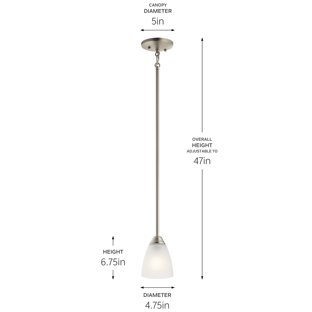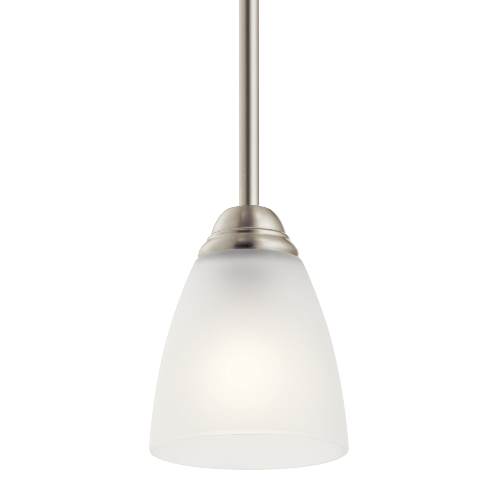 Enjoy the splendor of this Brushed Nickel 1 light LED mini pendant from the refreshing Jolie Collection. The clean lines are beautifully accented by satin etched glass. Jolie is the perfect transitional style for a variety of homes.