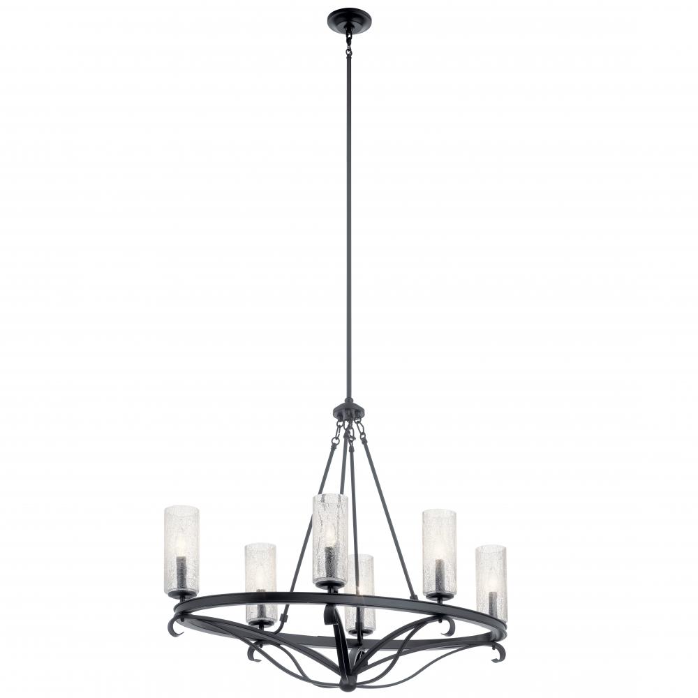 Black metalwork is making a big statement in today’s homes: in banisters, hardware and more. The Krysia collection’s gently bended metal frame mimics this ironwork for a cohesive touch. Crackle glass shades soften the overall look and add sparkle to the light.