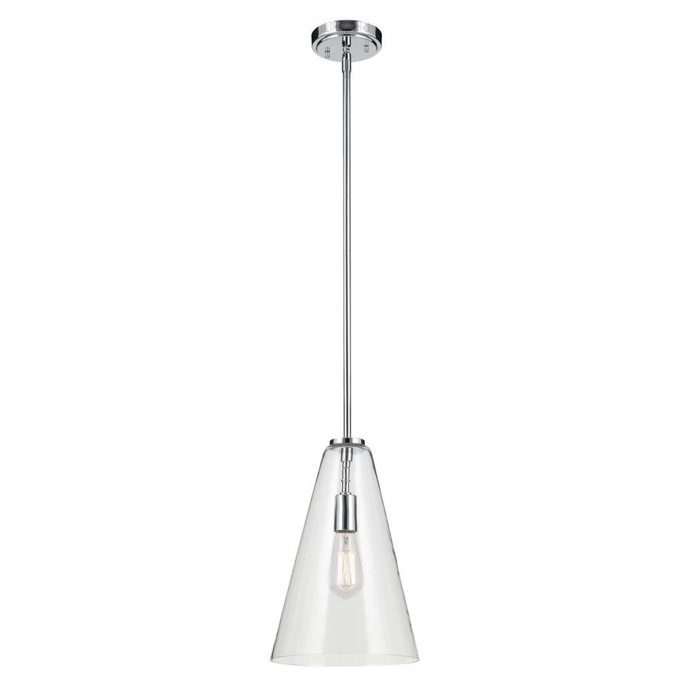 A modern style with minimal detailing, the Everly 1-light pendant easily elevates the style of soft modern environments. This elegant pendant offers a conical form and contemporary, clear glass silhouette that provides ambient lighting to the entire room. As beautiful as it is versatile, adjust the hanging height to meet the needs of your space