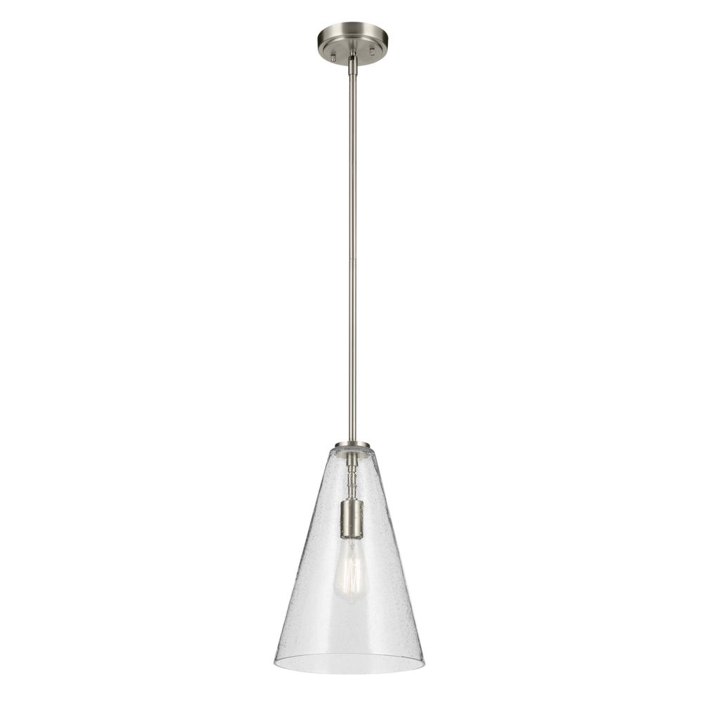 A modern style with minimal detailing, the Everly 1-light pendant easily elevates the style of soft modern environments. This elegant pendant offers a conical form and contemporary, clear seeded glass that creates a soft, ambient glow, adding warmth as it shines. As beautiful as it is versatile, adjust the hanging height to meet the needs of your space