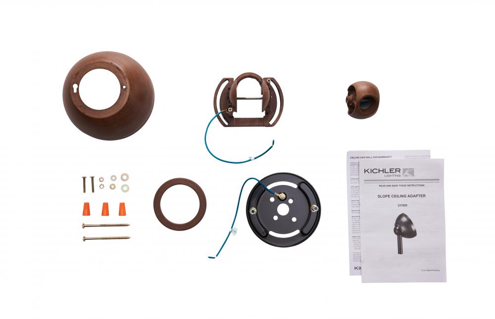 60 degree Slope Adapter for sloped or vaulted ceilings from 0 - 60 degrees. Includes stabilized mounting system in a Walnut finish. Designed for Indoor or Outdoor use. Downrod not included.