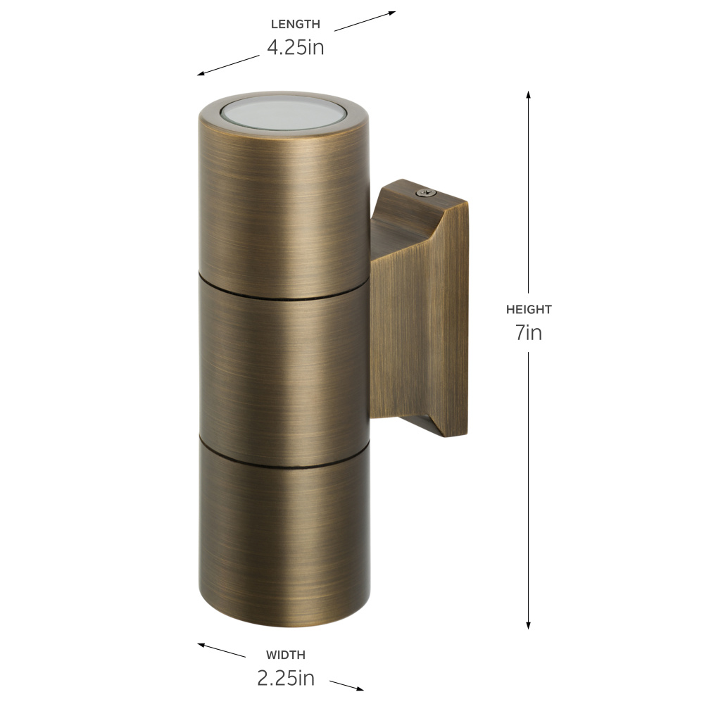 Elevate your outdoor lighting with the elegance, functionality, and resilience of the large up & down sconce. Constructed from solid, cast brass, this sconce is designed to withstand harsh weather and coastal conditions all year round. Its flush lenses prevent water accumulation while its threaded and sealed construction protects against water ingress. As versatile as it is practical, its 1 upward facing MR16 Bi bin and 1 downward facing MR16 Bi Pin socket lamp base is optimized for Kichler LED drop-in lamps, providing easy installation and light output. Its reduced-size mounting bracket and hardware allow for clean, precise installations on narrow beams, rails, and posts—ideal for pool cages and screen room enclosures. Featuring dual-directional MR16 lamps, this fixture projects light both upward and downward, creating a stunning ambiance and unique lighting effect.