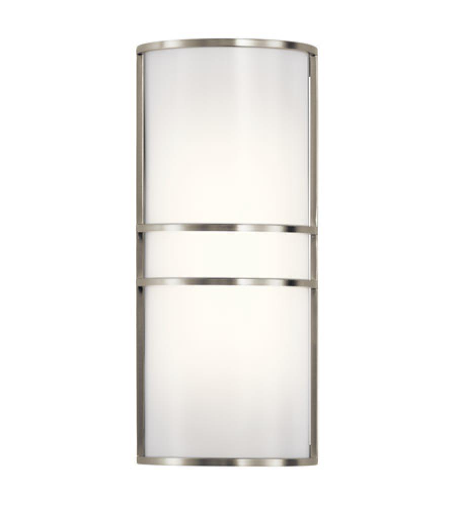 This 16" 2-light LED wall sconce is in a transitional style and features a Brushed Nickel finish. White acrylic provides an even diffusion of light.