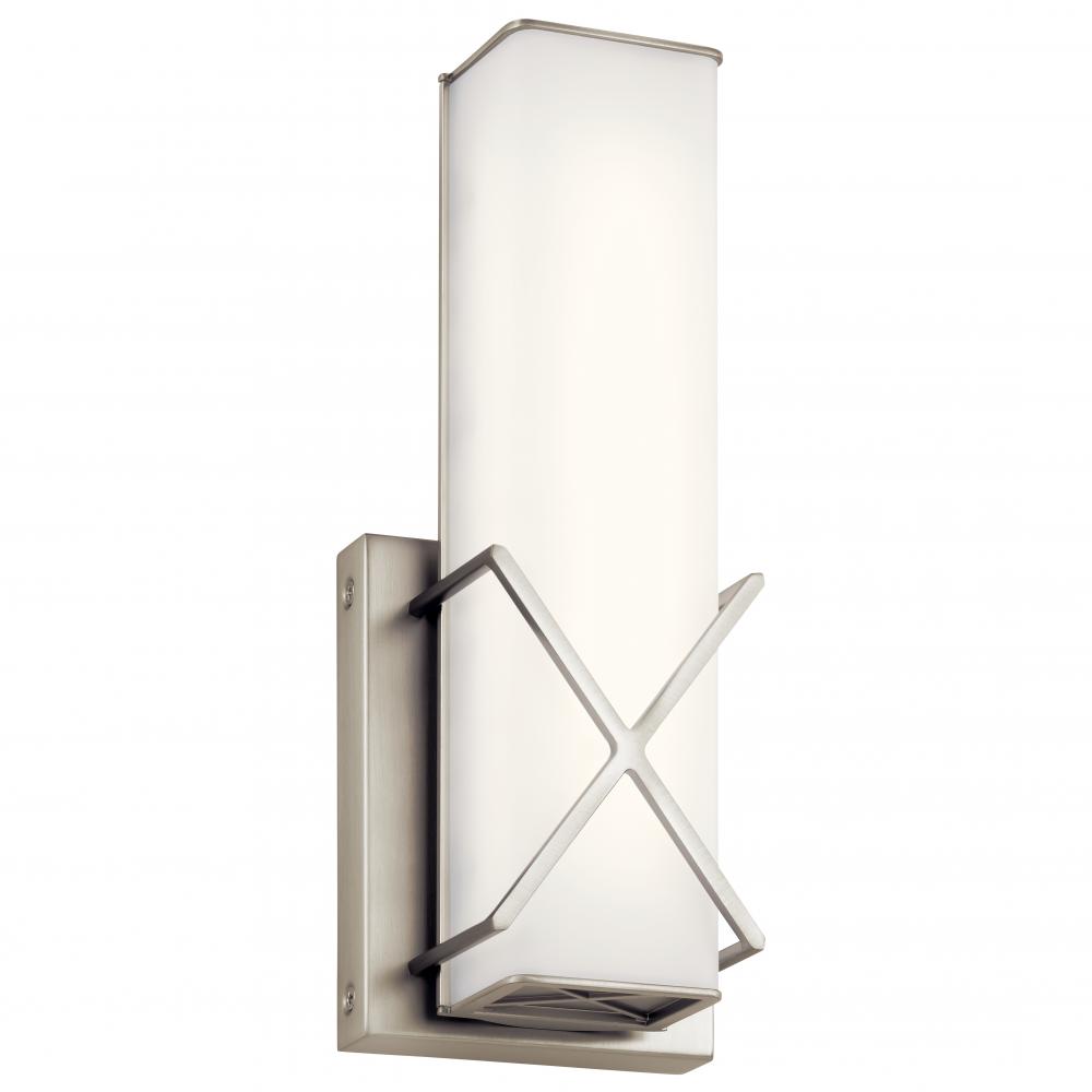 The LED Wall Sconce of the Trinsic collection is an intricate, yet subtle aesthetic to complement any modern bath with Satin Etched White glass and a unique criss-cross design in a Nickel finish.