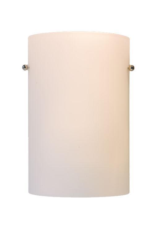 Single lamp wall sconce with half cylinder shaped white opal glass. Metal details in brushed nickel and chrome finish, both decorative nut finish options included within fixture.