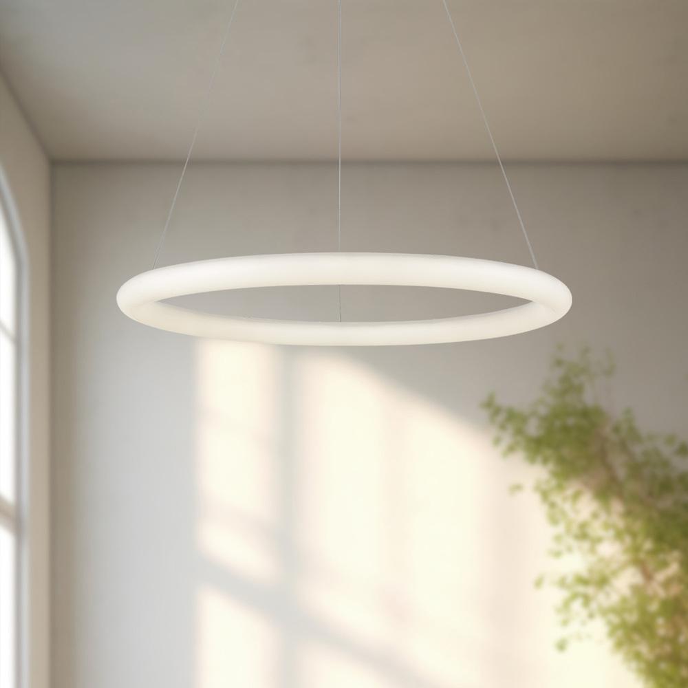 An illuminated circumference of bright uniform light the Cumulus Minor is devoid of extraneous detail appearing as a single endless loop. The miniscule ovoid profile of the polymeric ring condenses the lamp assembly into a compact yet airy visual footprint, a reduced scale from the substantial Cumulus pendant series. Available in multiple sizes.