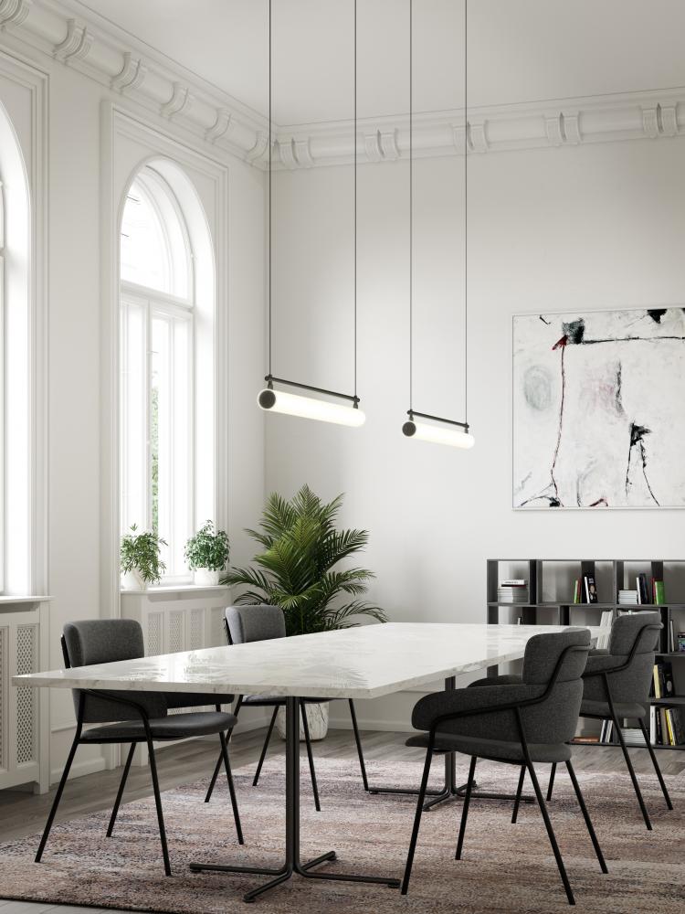 Frosted glass cylinders, available as a single or in multiples, are composed around an aluminum die-cast body, emitting an even 36 Degrees glow of ambient light. The Gramercy standing fixtures feature a touch dimmer and a black finish