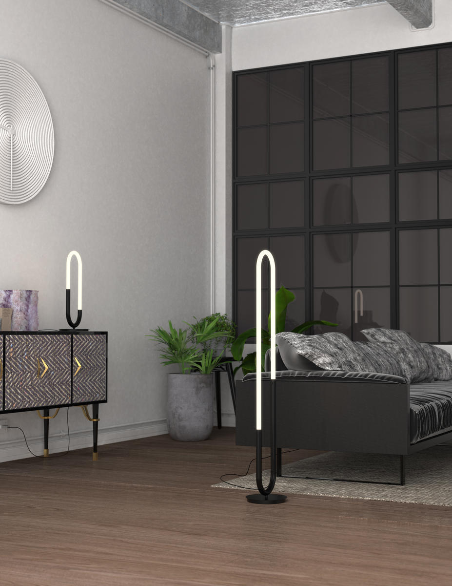 Steel base with die-cast aluminum body, acrylic frosted tube, matte powder-coated or plated finish
