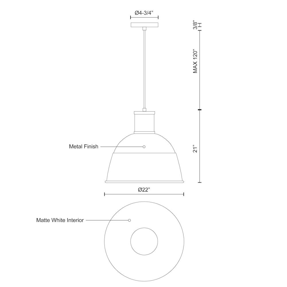 Single-lamp pendant with aluminum dome shade showcasing powder-coated finishes. Exterior shade colors are black, white or blue, with matte white interior. Suspended by cloth cable to a maximum 120" length. Available in three sizes.