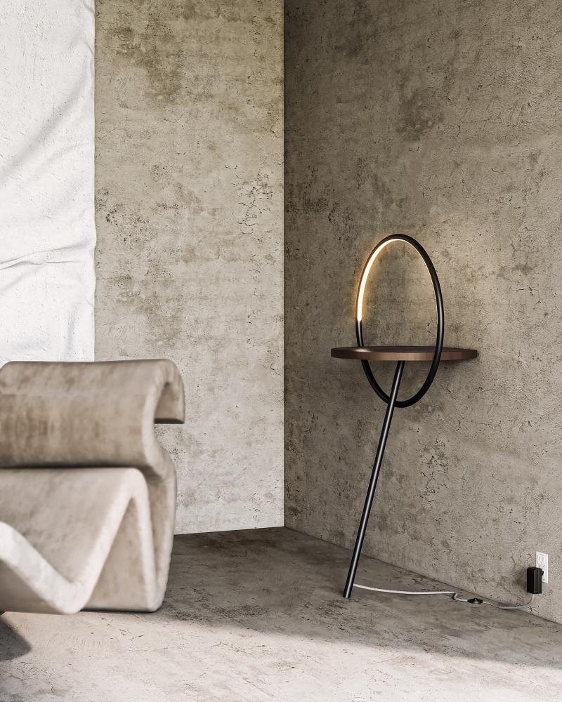 Designed to integrate seamlessly within the architecture of a space, the Maya leaning floor lamp melds the worlds between lighting and home furnishings. This floor lamp is designed to provide both light and support in the form of a dual end table and lamp. Perfect for bedside or living rooms, the Maya is easily situated in any modern space. Tabletop is finished in a stunning walnut stained wood, paired with our signature Matte Black hardware.