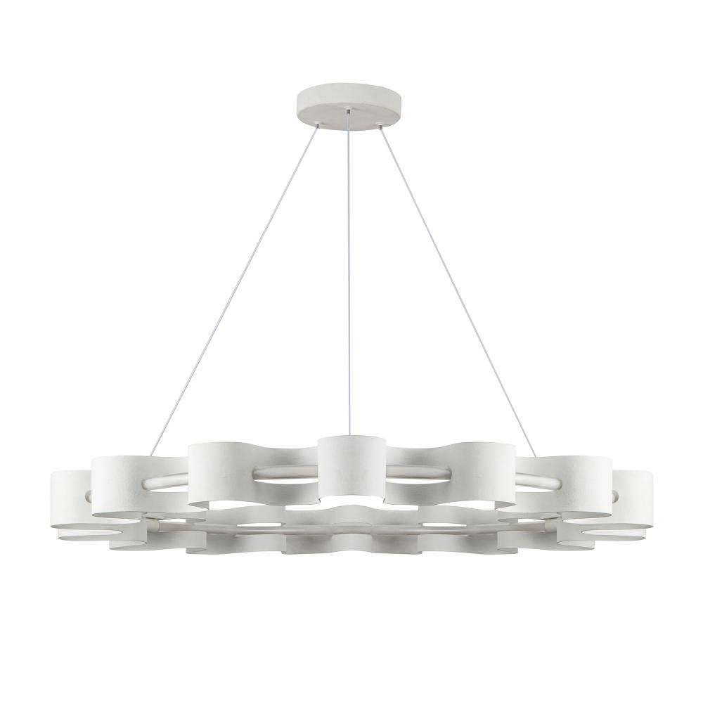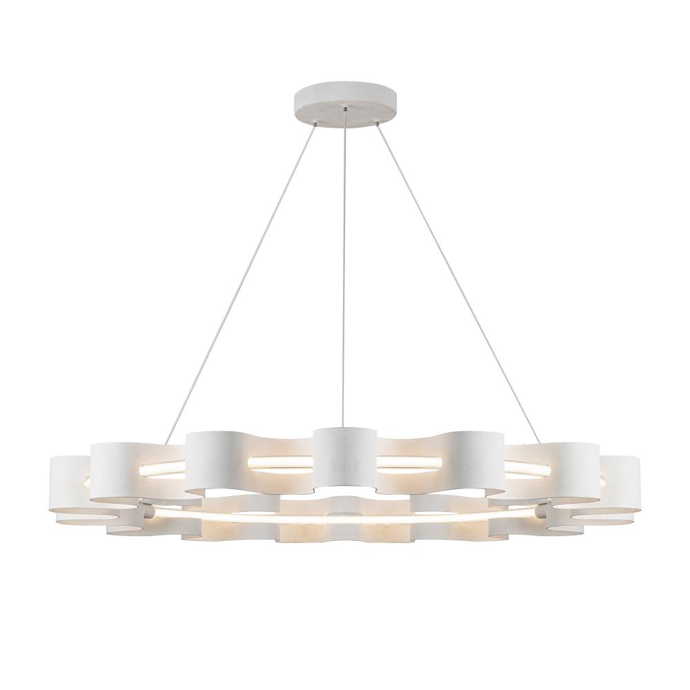 The Nami collection creates organic waves throughout its fluid design. The outer ring of the Nami chandelier provides organic structure, sculpted out of aluminum, and finished in either Glossy Black or Antique White. The inner ring provides ample yet soft illumination to the design, reflecting off of the metal layer elegantly.