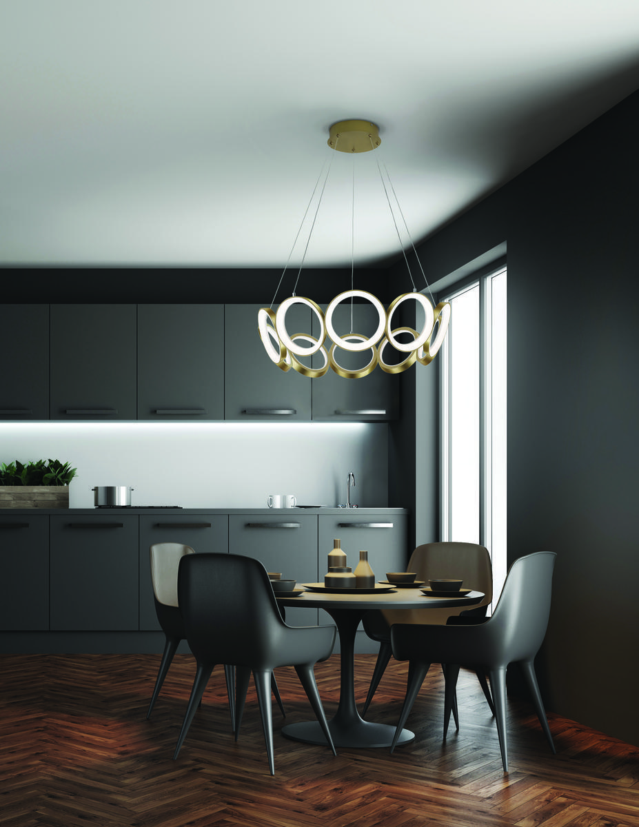 Diecast aluminum rings with translucent acrylic diffusers. Metallic brushed finish or matte powder-coated. Outward emitting light. May be mounted horizontally or vertically. Custom options available.