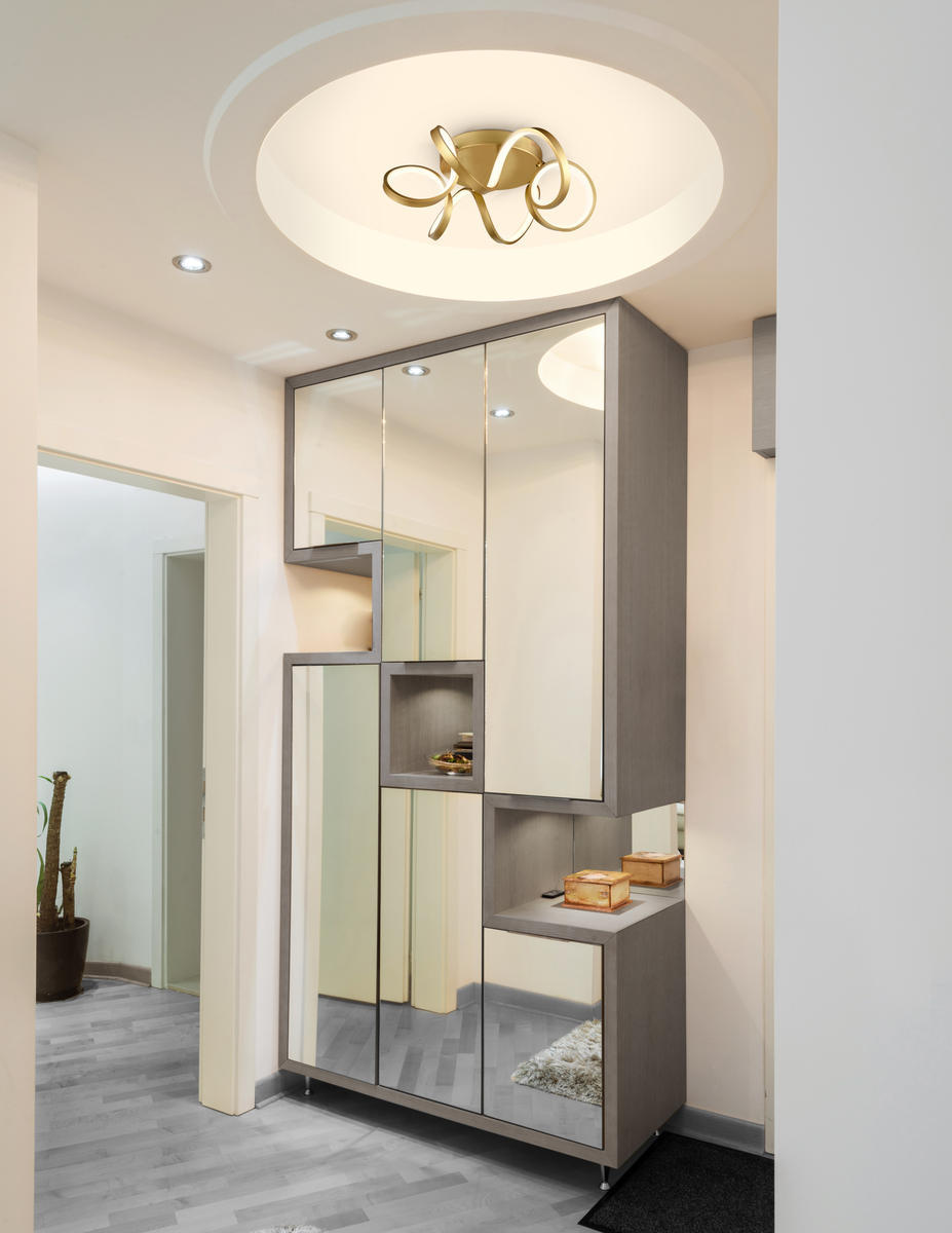 A looping radiant line casts light across space in a continuous helical path. The Synergy series is characterized by the rolled rectangular extrusion, which emits soft light through the silicon opal lens. Configured in both linear and ring arrangements, the arcing aluminum allows the curated finishes to be visible at every angle.