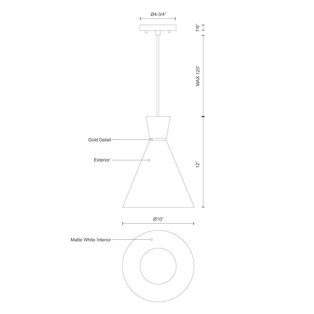 Single-lamp pendant with conical aluminum shade with fine powder-coated finishes and anodized gold ring detail. Exterior shade colors are white or black, with matte white interior. Suspended by cloth cable