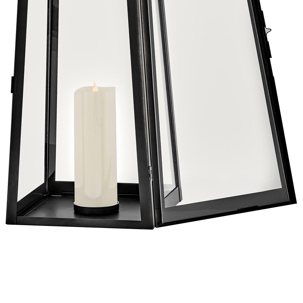 Hype up your alfresco area with the Hugh Decorative Lantern and its sleek, transitional style. The trapezoidal design features bold, over-scaled clear glass panes paired with a bold metal frame to inject a modern edge. with this decorative lantern, you can take the light where you need it, whether that's on a porch, a screened-in patio, or next to an inside fireplace. with an LED faux flame wick candle included, it's easy to make Hugh pop inside or out, with no electrical wiring required.