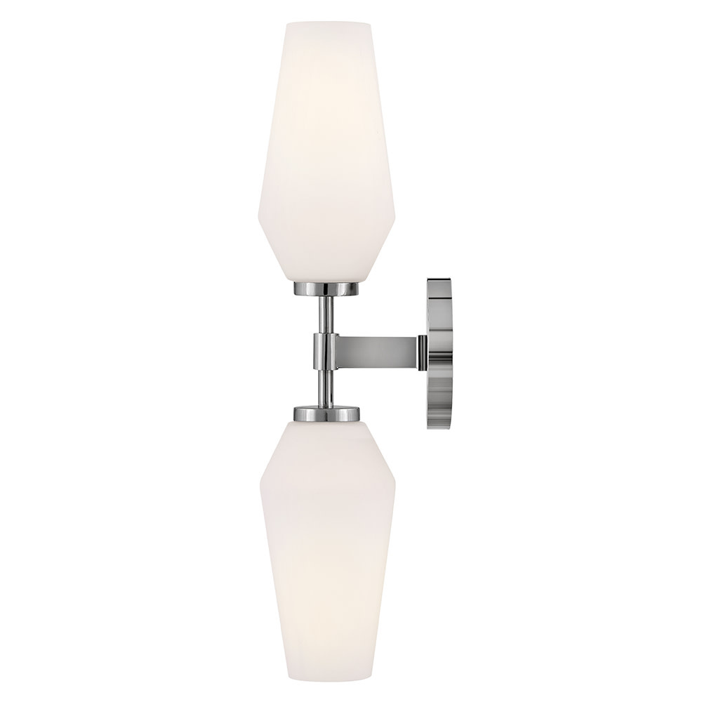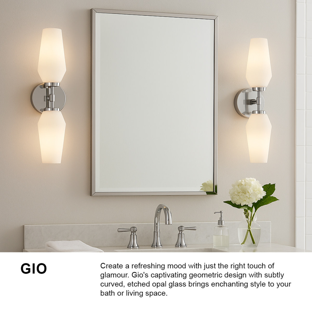 Create a refreshing mood with just the right touch of glamour. Gio's captivating geometric design with subtly curved, etched or cased opal glass brings enchanting style to your bath or living space.