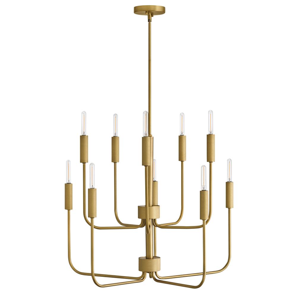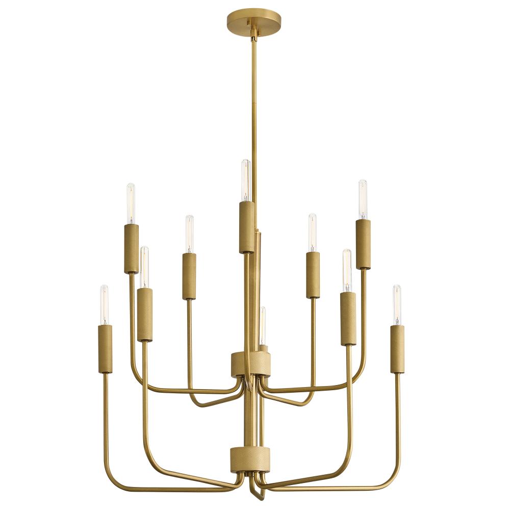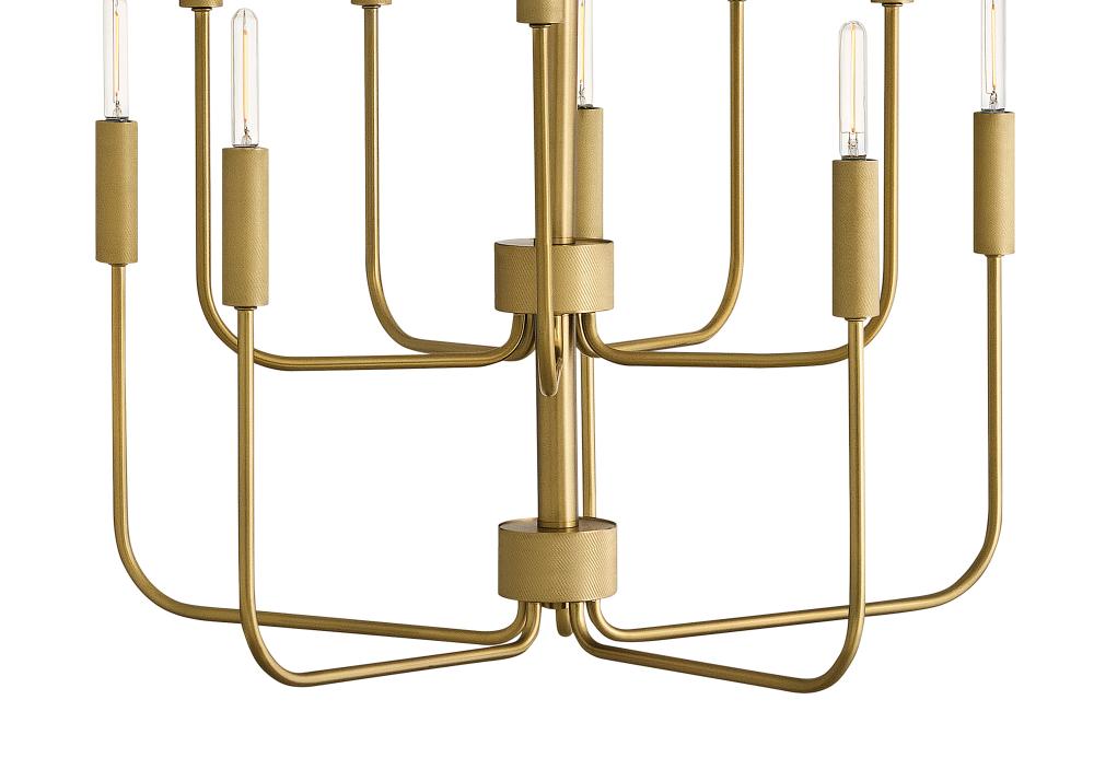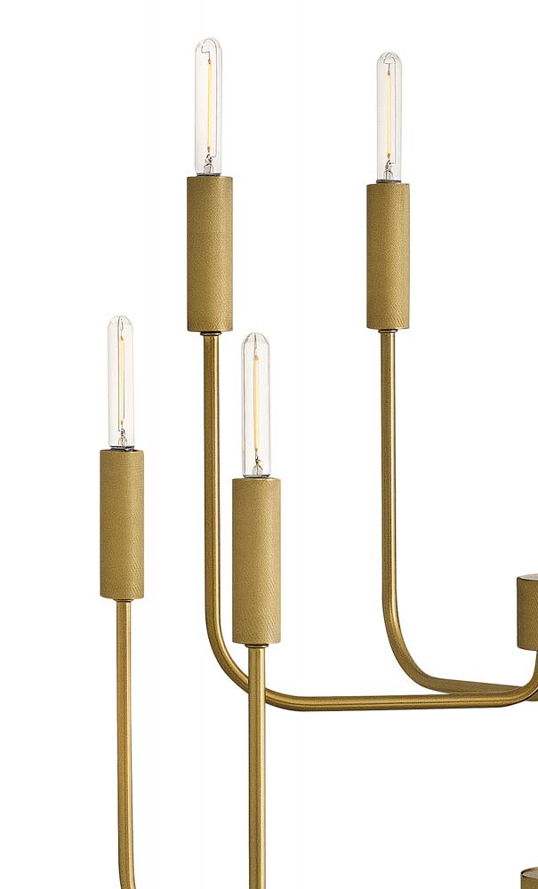 Austen’s slim, exaggerated design creates a chic transitional shape accentuated by knurled candle sleeves and stem details. Black and Lacquered Brass finishes are complemented by exposed bulbs. Experiment with different lamps to find a look that’s perfect for your space.