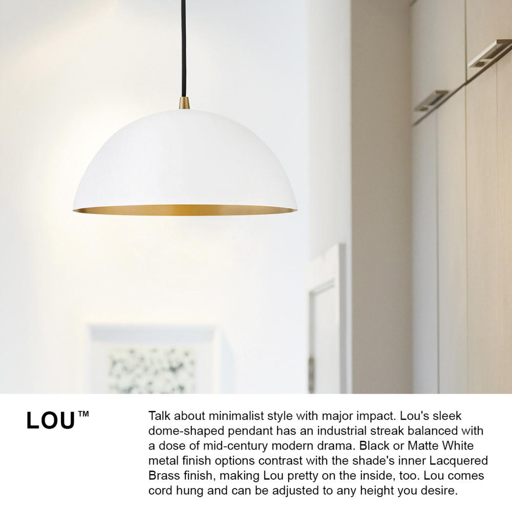 Talk about minimalist style with major impact. Lou’s sleek dome-shaped pendant has an industrial streak balanced with a dose of mid-century modern drama. Black or Matte White metal finish options contrast with the shade’s inner Lacquered Brass finish, making Lou pretty on the inside too. Lou comes cord hung and can be adjusted to any height you desire.