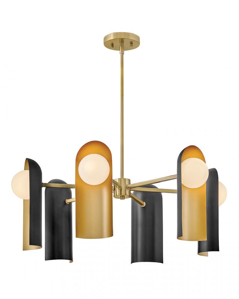 A modern drama queen, Zuri features a striking silhouette. Bold Satin Off-White or Black shades serve up serious glam with Lacquered Brass interiors. Sleek, coordinating details bring attention to dimmable LED lamps.