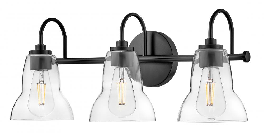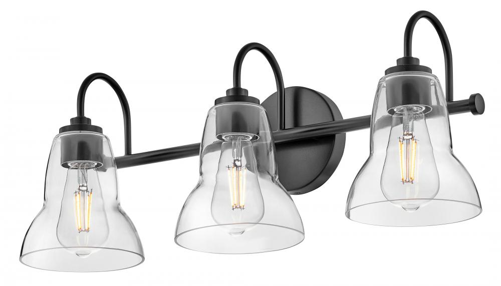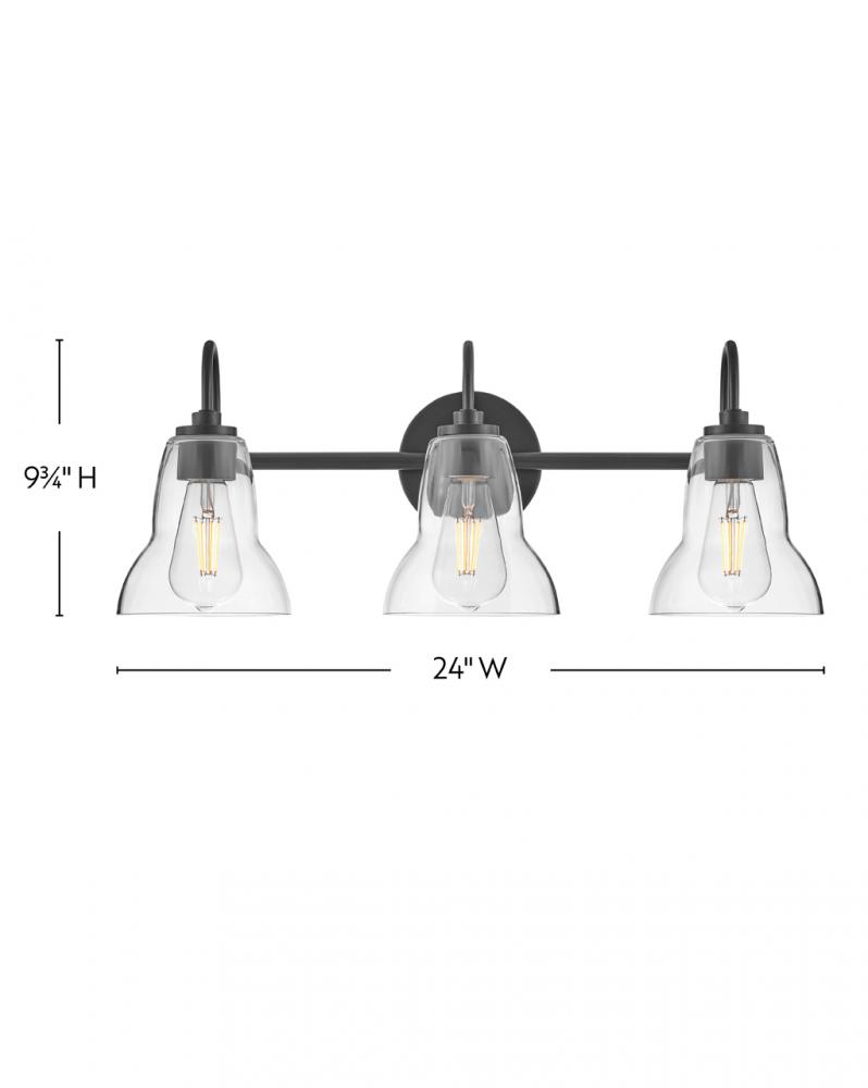 Vera’s unique, shapely form takes the traditional bell-shaped shades to a new level. Plenty of light shines up or down from the clear glass, making it a functional choice for main baths and powder rooms alike. Finished in Black or Lacquered Brass, Vera’s chic profile brings transitional style to any space.