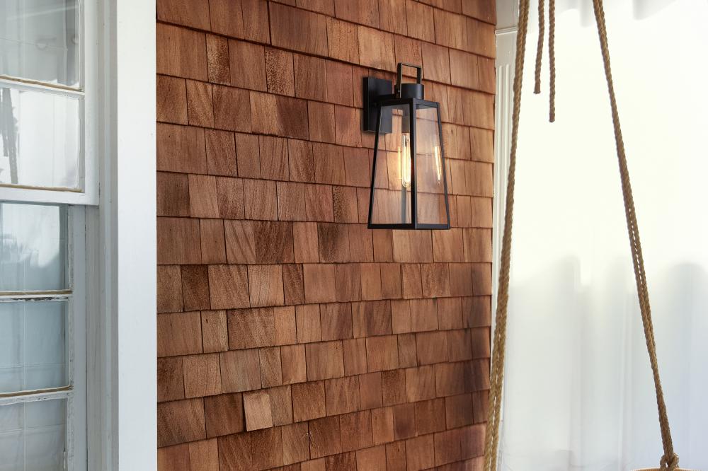 Hype up your alfresco area with the Hugh outdoor lantern and its sleek transitional style. The trapezoidal design features bold over scaled clear glass panes framed by carefully curated two-tone metal finish options to inject a modern edge. Choose from classic Antique Brushed Aluminum with a matte Black accent or a rich Black with a warm Burnished Bronze accent. Pro tip: we recommend a tubular vintage filament bulb to make Hugh pop on porches, patios or amp up any exterior space.