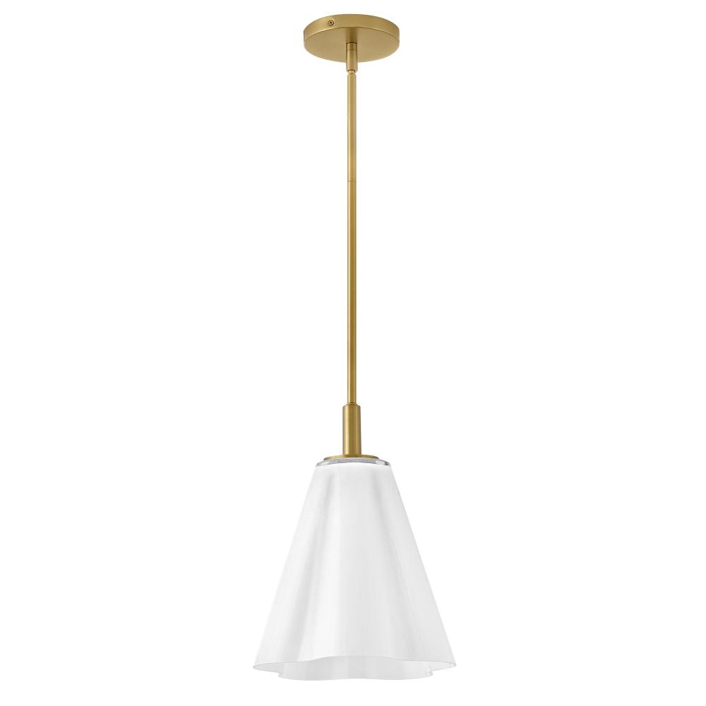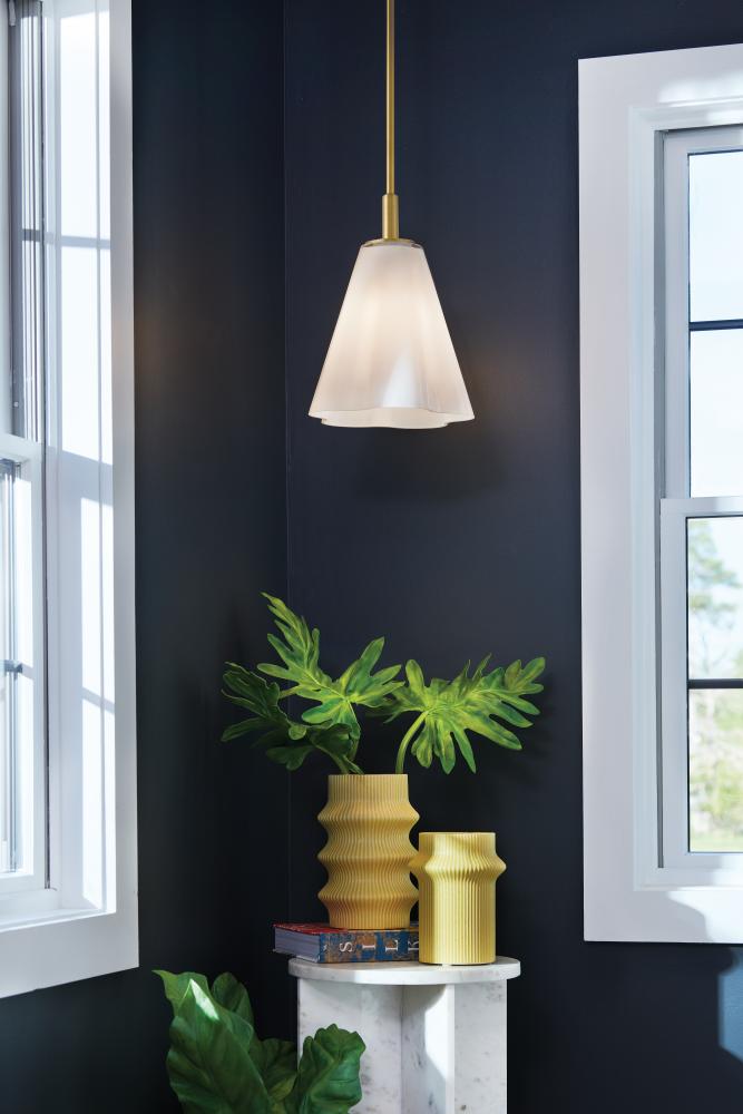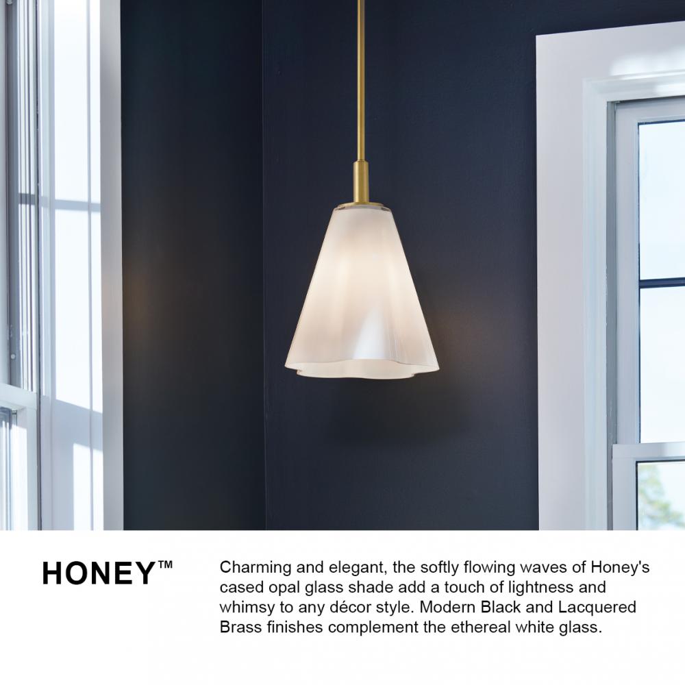 Charming and elegant, the softly flowing waves of Honey’s cased opal glass shade add a touch of lightness and whimsy to any décor style. Modern Black and Lacquered Brass finishes complement the ethereal white glass.