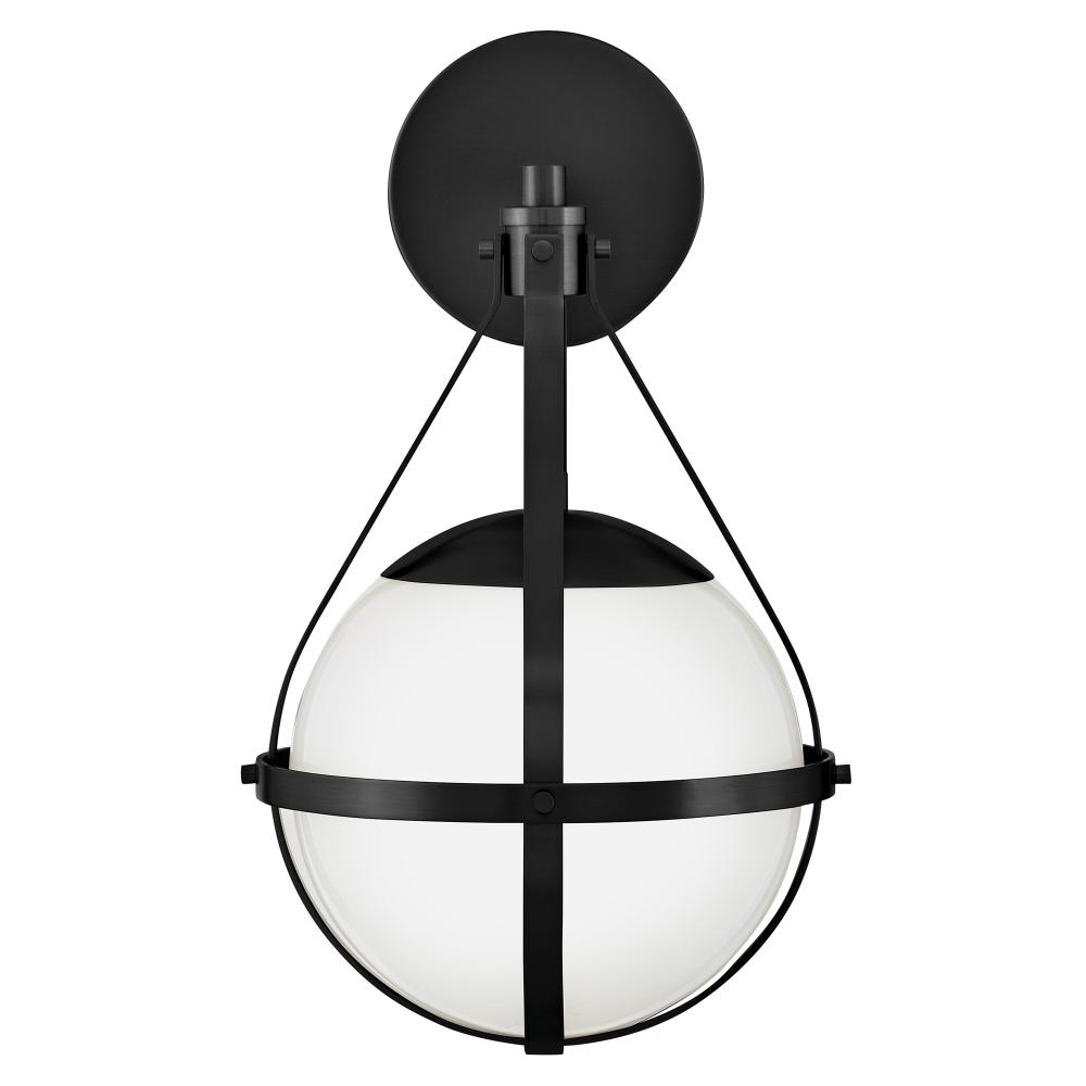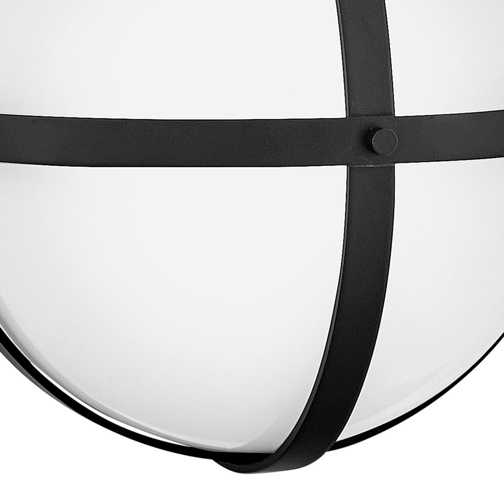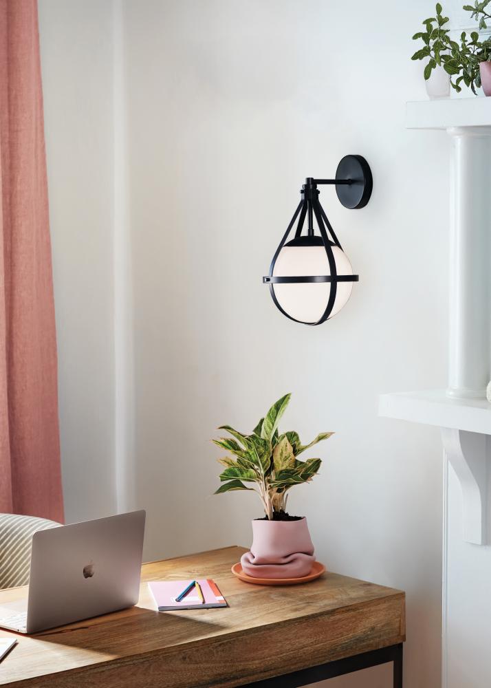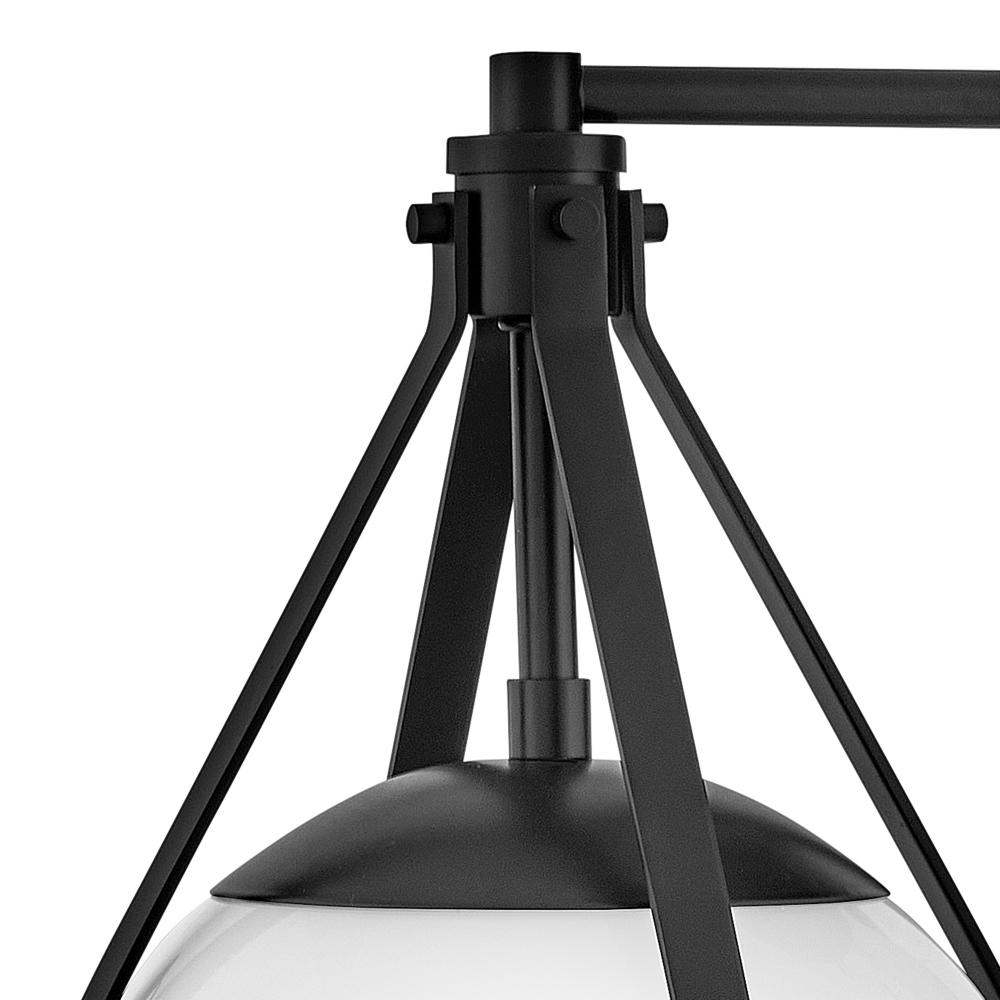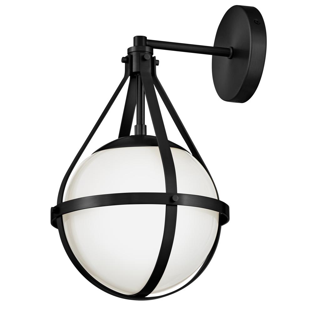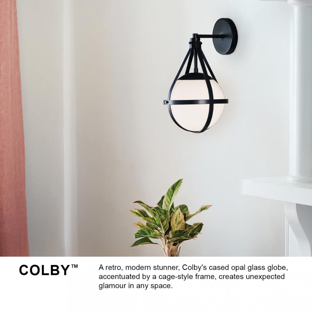 A retro, modern stunner, Colby’s cased opal glass globe, accentuated by a cage-style frame, creates unexpected glamour in any space.