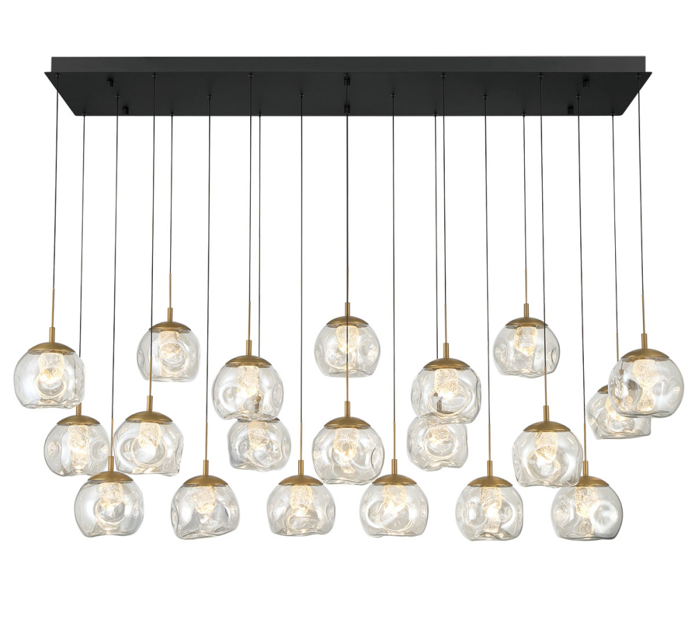 This dramatic light fixture showcases a cascading cluster of hand blown transparent glass globes, each one uniquely shaped with gentle, organic contours creating more reflection